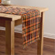 Coureur de table dans un Plaidwerx motif plaid original en orange vif, marron rougeâtre et jaune, avec des reflets noirs et gris.