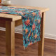 Un joli coureur de table avec un motif floral en papier transparent contre un arrière - plan bleu.