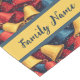 Customisez ce festif coureur de table motif de cloche rouge, bleu et jaune avec votre nom de famille. Parfait pour le décor de Noël de saison!