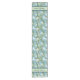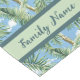 Personnalisez ce magnifique chemin de table floral avec un motif de feuilles de palmier et de frangipanier sur un fond bleu ciel avec votre nom de famille. Parfait pour une décoration aux accents de plage.