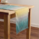 The Sunlit Mist table runner flows with the quiet rhythm of a dawn soundtrack. Soft gold melts into blush, then drifts into cool teal and deep undertones, creating a layered gradient that feels like a slow build in your favorite song. The colors move like harmony lines, rising and falling in smooth transitions that bring atmosphere to any space.