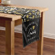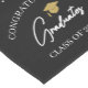 Graduation celebration decor for a graduation party celebrating several graduates and their accomplishments. Decorate the table with this graduation party table runner in black with a pattern of graduation caps and diplomas in white and a golden tan color. The table runner is printed with your custom text. Personalize by adding the year this class is graduating.