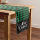 Holiday table runner is shown with a black and green buffalo plaid.
