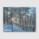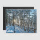 Vue sur la pinède enneigée avec des rayons du soleil et chemin en bois pour une promenade relaxante. Couvert de pins, de sapins et d'épinettes.