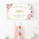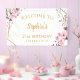 Bienvenue aux invités à une fête inoubliable avec notre grande bannière de bienvenue 21st Cherry Blossom, ornée de fleurs de sakura japonaises captivantes et de lignes dorées gracieuses et astucieusement disposées en une magnifique couronne. Cette bannière élégante donne le ton pour une occasion mémorable. Le modèle présente un texte personnalisé élégamment courbé, invitant les invités avec un chaleureux "Bienvenue à" suivi du nom de la fille d'anniversaire dans un joli script cursif, puis l'occasion, avec une autre ligne de texte personnalisée ajoutant le mot "célébration", le tout présenté en jaune doré opulent sur un fond blanc immaculé. Cette bannière dégage un air de sophistication et d'enchantement, créant une ambiance captivante pour une fête joyeuse.
