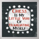 Un design typographique irrévérencieux qui dit "Les échecs, c'est ma petite façon de m'humilier". Il présente du texte noir et rouge sur un rectangle blanc avec des points blancs amusants et amusants qui l'entourent, le tout sur un arrière - plan gris foncé.