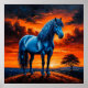 Une représentation artistique captivante d'un cheval bleu sous un ciel de coucher de soleil orange et rouge vif. Montre des détails incroyables, mettant en évidence la beauté de la nature et de la faune dans un cadre surréaliste.