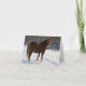 Une carte de Noël et de nouvelle année pour des amoureux des animaux avec une photo d'un cheval de châtaigne, éclairée à contre-jour par le soleil de soirée, se tenant dans la neige.