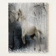 Cheval blanc sur texture bois rustique dans la forêt de montagne enneigée d'hiver.