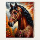 Une représentation époustouflante d'un cheval noble orné d'or complexe et de décorations de pierres précieuses, dans un décor vibrant de forêt automnale, aux couleurs audacieuses et à la beauté naturelle captivante.
