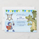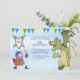 Cette invitation présente un dragon et un chevalier sur un arrière - plan bleu et blanc. Le chevalier tient une épée et un bouclier tandis qu'un dragon gronde au chevalier. L'invitation idéale pour les enfants qui aiment les temps médiévaux.