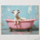 Un tableau blanc représentant une chèvre blanche avec des cornes se relaxant dans une baignoire rose vintage, dressé contre un mur bleu clair pour une scène rustique charmante et ludique.