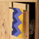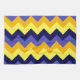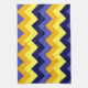 Une serviette de cuisine au design motif et à l'ombre des chevrons en bleu, jaune et or.
