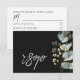 This elegant RSVP card features a sophisticated black botanical design with soft eucalyptus greenery along the edge, creating a romantic and modern wedding stationery style. The clean layout includes space for guest names, acceptance selection, guest count, and a convenient QR code for digital responses. The reverse side showcases a stylish black background with graceful script “RSVP” lettering and botanical accents, perfect for contemporary, minimalist, or garden-inspired weddings.