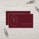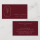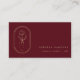 Logo chic bohème à fleurs dorées, cartes de visite professionnels. Cadre en feuille dorée molle avec tige florale et main délicate sur arrière - plan bordeaux. Lignes de texte modèles pour toutes vos informations de contact à l'arrière.