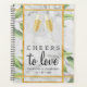 Ce design Cheers to Love présente deux verres de champagne dans un toast à l'amour pour un mariage ou un anniversaire de mariage. Cet élégant organisateur et organisateur de mariage dispose d'un design avec un bel arrière - plan en marbre blanc marie un cadre doré avec des accents botaniques. Personnalisez cet objet avec vos noms et la date de votre événement.
