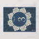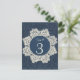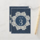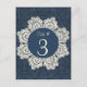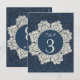 Jolie carte de numéro de table de réception de mariage chic de campagne, fait en bleu sur le motif damassé denim bleu. Les graphiques d'un ancien élégant comme l'ivoire doily, au milieu, a une zone de texte de disque rond bleu. Customisez le numéro de chaque table à la réception et le texte, au verso de la carte. Cartes d'escorte mariages, invitations et autres produits disponibles.