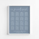 Poster chic téléchargeable en bleu mariage pour 16 tables maximum avec vos noms et date de mariage dans la typographie classique de serif blanc, "nos favoris" dans un script blanc élégant et les numéros de table et les noms de vos invités en lettres blanches simples. Vous pouvez sélectionner l'option de téléchargement numérique à modifier avec des modifications de dernière minute et imprimer localement.