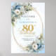 Celebrate a remarkable milestone with this elegant 80th birthday welcome sign featuring watercolor dusty blue and white flowers, soft eucalyptus greenery, and a shimmering gold frame. Designed in chic boho style with graceful script lettering, this floral welcome poster creates a stunning entrance display. Perfect for classy, garden, or luxury 80th birthday celebrations and unforgettable party décor.