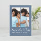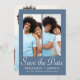 Ce mariage chic enregistrer la carte faire-part date comporte trois photos et élégant blanc enregistrer le script de calligraphie date sur un arrière - plan bleu poussiéreux. Le dos est une photo complète. Faites savoir aux invités que vous les inviterez à votre prochain mariage avec cette simple photo minimaliste sauvegarder la carte de date (les invitations de mariage de coordination classique peuvent être envoyées à une date ultérieure, et sont disponibles pour être achetés séparément).