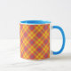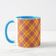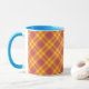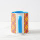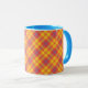 Une chic tasse à café en céramique blanche, avec une lèvre bleue et une poignée et un motif plaid en rouge vif, jaune et bleu. Faisant partie de la collection Posh & Painterly 'Rangoli', ce motif carrelé audacieux peut être ajusté pour s'adapter à n'importe quelle Mug de café.