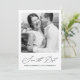 Élégante carte de save the date avec calligraphie et photo au dos bleu foncé.