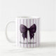 Add a touch of sophisticated flair to your daily routine with this stunning mug. A richly detailed, deep purple satin bow is the focal point, set against a charming pattern of pastel purple and white vertical stripes. Your name is beautifully inscribed beneath the bow in a graceful script, making it uniquely yours. This design is ideal for those who love classic elegance with a modern twist, bringing a sense of refined beauty to your kitchen or office space.