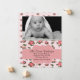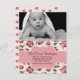 Elégant faire-part de naissance photo personnalisée fait dans un motif rose rose, avec des graphiques d'un bord de dentelle d'ivoire, en haut. Une photo personnalisée pour bébé décore le dessus, de la carte plate, avec une zone de texte de bande décorative rose, à travers le motif floral, avec du texte noir prêt à personnaliser, avec les informations de naissance de votre bébé. Une façon douce et élégante d'annoncer l'arrivée de votre petite fille, à vos amis et votre famille.