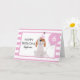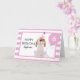 Carte d'anniversaire à thème chiot pour une fille. L'âge et le nom sont facilement modifiables en ligne. La carte a une jolie illustration d'un chien avec un casquette de fête et un ballon rose. L'arrière - plan est à rayures roses et blanches. Il dit "J'espère que vous avez un anniversaire PAWSOME" à l'intérieur de la carte.