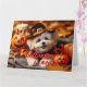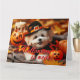 Carte d'Halloween avec le chien de Maltipoo. Un mignon chien moelleux Maltipoo dans un costume d'Halloween dans une pièce d'ambiance automnale, avec l'inscription Halloween arrive. Ce cadeau inspirera votre amoureux des chiens Maltipoo. Il apportera également une ambiance festive à votre ami.