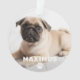 L'ornement personnalisé pour animaux de compagnie pour les amoureux de les chiens comprend une photo de votre ami furry sur le devant avec un monogramme de prénom simple et moderne avec accent empreinte de patte en blanc. Un motif coordonnateur d'empreintes de pattes habille le dos de l'ornement. La douce couleur noire de l'arrière - plan sur le dos peut être customisée pour coordonner avec votre photo ou décor de Noël.