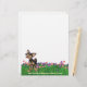 Animal Parade Chihuahua Chig Coordination Stationery et Accessoires personnalisés présente notre art original d'un personnage Chihuahua Chichien mignon noir et tan debout dans une cour herbeuse avec un ciel bleu et violet texturé avec une bordure ondulée violet ludique. Cet art amusant pour animaux de compagnie, peint par Traci Van Wagoner, un illustrateur de talent pour enfants, est parfait pour les amoureux du Chihuahua, les amoureux de les chiens et les amateurs d’art animal humoristique de tous âges. Sur beaucoup de nos accessoires fantaisistes de papeterie pour petits chiens, vous trouverez ce chien mignon qui va et vient avec sa tête sur un côté et cette queue sur l'autre. Rejoignez la Parade des animaux et souvenez-vous de quelqu'un que vous aimez avec un cadeau de nos jolies pièces de papeterie Chihuahua personnalisées et coordonnées. Malheur !
