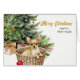 Sur cette carte de vacances, un adorable chien Chihuahua repose dans son lit en osier en face d'un sapin de Noël décoré. Derrière le panier se trouve un joli bouquet de baies rouges et de cônes de pins. Le texte en or à droite dit "MERRY CHRISTMAS", avec HAPPY NEW YEAR en vert en dessous. Tout le texte, à l'intérieur et à l'extérieur, peut être facilement changé à tout ce que vous voulez. Vous pouvez voir d'autres images de Chihuahua, ainsi que d'autres images de races, sur Dog Village.