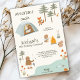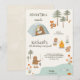 Children's birthday invitation with a camping theme. Features animals like a fox and bear, tent, and campfire. Text reads “Adventure awaits” and gives event details.