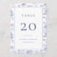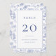 Vintage Regency Blue Chinoiserie Garden Floral, carte numéro de table mariage. Caractéristiques, élégant style Chinoiserie jardin à motif floral et cadre de bordure avant. Veuillez noter que les cartes de numéro de table doivent être numérotées et ajoutées individuellement à votre panier.