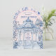 Cette invitation à la fête du thé a un design chinoiserie avec une pagode bleue et blanche sur un arrière - plan rose. La bordure voûtée a un motif de branche fleurie bleue sur un arrière - plan rose vif. L'avant et l'arrière ont un motif de coordination.