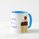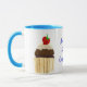Un Ringer Mug blanc avec une jante bleu poudre et une poignée avec un cupcake au chocolat de chaque côté, surmonté d'une fraise et crème. 'N'importe qui pour un cupcake' est écrit entre les deux cupcakes en bleu. Le dessin est tiré d'un collage de papier peint à la main par Judy Adamson. Vous pouvez également être intéressé par d'autres modèles de cupcake de Judy Adamson sur des cartes de voeux et des T-shirts.