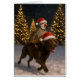 Humorous Christmas card featuring a chocolate / brown Labrador and a Partridge in an apparent truce over the Christmas period! The Partridge is riding the chocolate / brown Labrador in a snowy scene with Christmas trees twinkling in the background.