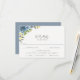 Disposition de fleurs et de feuillage aquarelle dans des nuances de bleu poussiéreux, jaune et vert, cartes de réponse de mariage avec option de choix de repas. Moderne et élégant modèle de style de typographie grise. Le dos de la carte présente une couleur bleu poussiéreux uni avec deux lignes de texte de modèle pour les noms et la date.