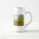 Un verre à bière avec une belle image d'un paysage naturel : un oiseau perché sur une clôture patinée, des fleurs sauvages poussant autour de la clôture, un agriculteur sur un tracteur, travaillant sa terre, des arbres avec des feuilles et des terres agricoles aux couleurs variées. L'arrière-plan, l'image et le texte peuvent être personnalisés. Œuvre originale de W.B.