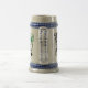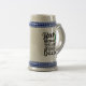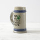 A gray and blue ceramic beer stein with a funny Irish humor quote about not being able to drink bacon.