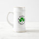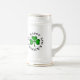 Une tasse à bière stein blanche avec un design de trèfle shamrock vert et un noir "HAPPY ST. PATRICK'S DAY" texte autour.