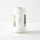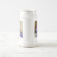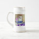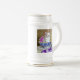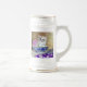Bière Stein avec un chaton blanc et moelleux ! Le chaton aux yeux bleus est assis dans un bol bleu avec des fleurs roses. Une couverture à fleurs violettes est drapée devant. Un cadeau merveilleux pour les amoureux de les chats et les amateurs d'art victorien !
