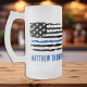Voici la tasse à café parfaite pour les policiers et les agents de la force publique, avec l'emblématique Thin Blue Line et le drapeau américain. Cette tasse est une excellente façon de montrer votre soutien à ceux qui servent et protègent nos collectivités. Personnalisez votre tasse avec votre nom et votre département pour la rendre vraiment unique. C'est une idée fantastique pour un diplôme d'une académie de police ou pendant la semaine d'appréciation de la police. Cette tasse en céramique de haute qualité est à la fois micro-ondes et lave-vaisselle coffre-fort, ce qui le rend pratique pour l'utilisation quotidienne. Il contient votre boisson chaude ou froide préférée, parfait pour une poussée de caféine pendant ces longues équipes. Montrez votre fierté et votre soutien à nos courageux policiers avec cette tasse personnalisée. Commandez le vôtre aujourd'hui et savourez votre café du matin en toute élégance ! DROIT D'AUTEUR © 2020 Judy Burrows, Black Dog Art - Tous droits réservés. Ligne Bleue Mince Officier de Police Personnalisé Vitrage Frosted Beer Mug