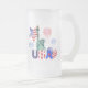 "USA" avec la Statue de la Liberté derrière elle et un coeur et une étoile dans le style drapeau américain, et feux d'artifice en rouge, blanc et bleu. Un grand cadeau pour le 4 juillet.