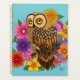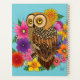 Chouette assise au milieu d'un bouquet de fleurs d'été colorées dans un décor bleu