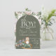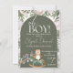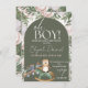 Un baby shower mignon design d'une chouette dans un cheval à bascule et un choo train en vert et pêche et blanc arrière - plan de couleur avec options de personnalisation.