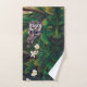 Un homme vert avec une chouette assise sur une branche d'arbre. Un mur de travail de noeud celtique en pierre derrière eux.