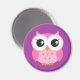 Aimant frigo rond ou aimant de casier avec une jolie illustration d'un petit hibou de dessin animé rose sur un arrière - plan violet. Design amusant pour les filles.
