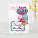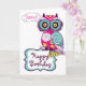 Illustration de chouette rouge chartreuse, rose chaud, bleu et violet foncé ornée de motifs floraux. C'est une carte d'anniversaire amusante et féminine pour votre famille et vos amis.